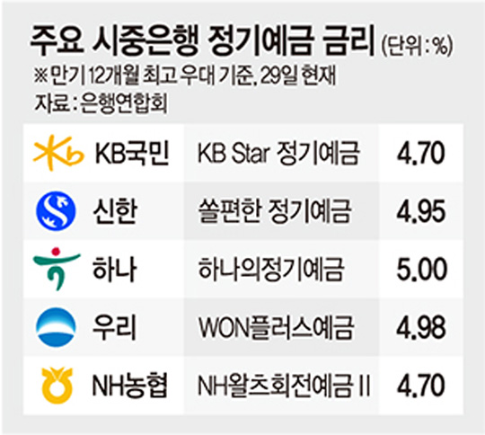 29일 전국은행연합회에 따르면 우리은행은 대표상품인 ‘우리 WON플러스 예금’에 연 4.98%의 금리를 제공한다. 이 상품은 주요 시중은행 정기예금 상품 중 가장 먼저 지난 13일 1년 만기에 연 5.18%의 금리를 제공했다. KB국민은행의 ‘KB STAR 정기예금’은 연 4.7%까지 떨어졌다. 이 상품 금리는 지난 14일 연 5%대에 올라섰지만 약 2주일 만에 0.3%포인트가량 하락했다. NH농협은행의 ‘NH올원e예금’ 1년 만기 상품 금리는 지난 14일만 해도 기본금리가 연 5.1%였다. 지금은 기본금리가 연 4.8%로 떨어진 대신 0.3%포인트의 특별우대 금리가 더해져 연 5.1%를 유지하고 있다. 신한은행의 ‘쏠편한 정기예금’과 하나은행의 ‘하나의정기예금’ 상품 금리는 각각 연 4.95%와 연 5.0% 수준에 머물고 있다.
