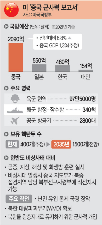특히 중국군의 작전 목적으로 2020년까지는 난민통제, 완충지대화 등만 거론됐으나 지난해부터 북한 대량파괴무기(WMD) 확보가 추가됐다. 또 대만과 군사력 격차가 계속 벌어지는 상황에서 중국이 2027년 군 현대화 목표를 달성하면 공산당의 대만 통일 목표에 강력한 도구가 될 수 있다고 우려했다.