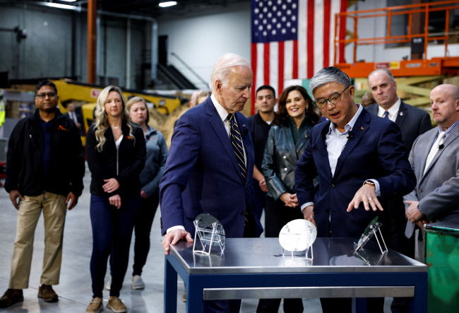 조 바이든(가운데 왼쪽) 미국 대통령이 29일 차세대 전력 반도체 핵심 소재 실리콘카바이드(SiC) 웨이퍼를 생산하는 미시간주 베이시티 소재 SK실트론 CSS 공장을 방문해 지안웨이 동(〃 오른쪽) CEO의 설명을 듣고 있다. 바이든 대통령은 “더 이상 중국 공급망의 인질이 되지 않겠다”면서 미국에 투자한 SK와 한국에 감사를 표했다.