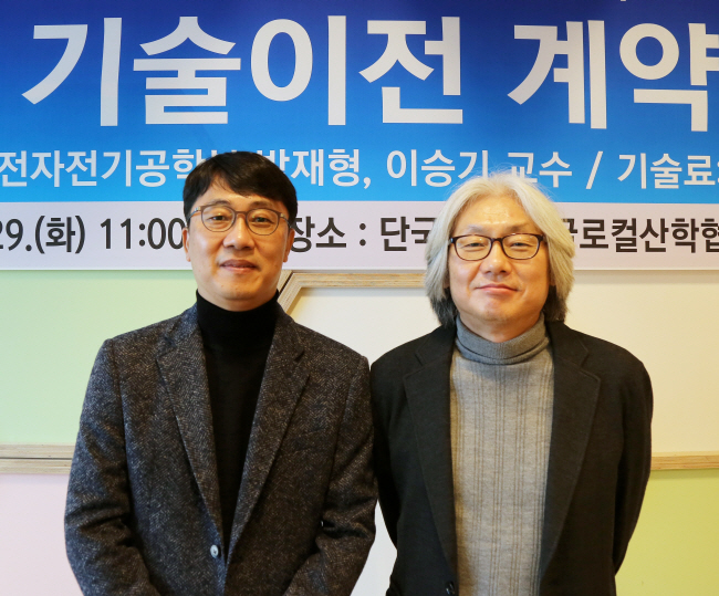 단국대는 반도체 공정에 필요한 핵심기술을 차세대 센서 전문기업 ㈜엠엔텍에 이전했다고 30일 밝혔다. 이전 기술은 전자전기공학부 박재형(왼쪽)·이승기(오른쪽) 교수의 ‘기판 관통 구조물 및 이의 제조방법’과 ‘기판 관통 구조물을 포함하는 소자의 패키지 기술’이다. 기술이전료는 1억 원이다. 박 교수에 따르면 이 기술은 다층 복합구조를 갖는 반도체 소자의 제작 및 패키징 기술로 적용, 반도체 신호의 손실을 크게 감소시켜 제작 단가를 인하하고, 전체 구조물의 크기도 절반 가까이 감소시킬 수 있다.