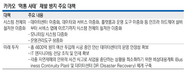 카카오가 지난 10월 발생한 ‘먹통 사태’의 재발을 막기 위해 데이터센터 등 인프라 하드웨어 설비부터 서비스 앱에 이르기까지 시스템 전체에 철저한 이중화 조치를 적용하기로 했다. 총 4600억 원의 예산을 투입해 경기 안산시에 짓고 있는 자체 데이터센터의 안정성을 강화하고, ‘재해복구 위원회’를 신설하기로 했다. 정보기술(IT) 엔지니어링 전담 조직과 비상대응계획(Business Continuity Plan)도 가동한다.