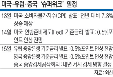 특히 미국 연방준비제도(Fed)의 기준금리 결정에 영향을 주는 미 소비자물가지수(CPI) 발표를 시작으로 Fed와 유럽 중앙은행, 영국 중앙은행 등 주요국 중앙은행들이 줄줄이 기준금리 결정에 나선다. ‘제로 코로나’ 정책에서 급선회하며 성장 동력 재가동을 노리는 중국도 중앙경제공작회의(中央經濟工作會議)를 열고 내년도 경제성장률 목표치를 논의할 전망이다.
