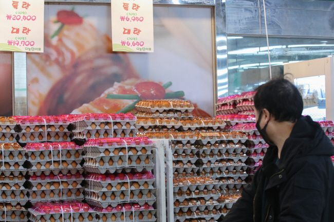 13일 서울 시내 한 마트에서 고객이 계란을 고르고 있다. 축산물품질평가원 축산유통정보에 따르면 조류인플루엔자(AI) 확산세에 지난 11일 기준 달걀 한판(특란 30개) 전국 평균 소비자 가격은 6740원이다. 1년 전(6090원)보다 10%, 평년(5547원)보다 20%가량 비싸다.