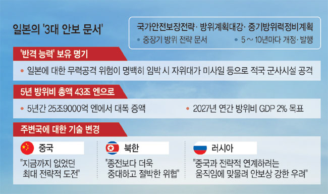 일본에서 5∼10년마다 개정·발행하는 3대 안보 문서는 일본의 중장기 군사 전략과 무기 보유 계획, 예상 재원 등을 담은 중요 지침이다. 이번 개정안의 핵심은 전후 최초로 반격능력 보유를 명기하기로 한 것이다. 일본은 북한을 ‘종전보다 더욱 중대하고 절박한 위협’으로, 러시아는 ‘중국과 전략적 연계를 강화하려는 움직임에 맞물려, 안보상 강한 우려’라고 규정했다. 니혼게이자이(日本經濟)신문은 반격 능력 부여에 대해 “러시아의 우크라이나 침공, 대만 유사 위험 고조 등 국제정세 급변에 대한 대응”이라며 “정부는 미군에 의지하는 것만이 아닌 자립적인 방위력의 구축을 목표로 한다”고 전했다. 특히 일본 정부는 반격 능력을 일본이 직접 공격받았을 때뿐 아니라 미국이 공격을 받은 경우에도 적용할 수 있다고 정했다. 사실상 유사시 선제공격 가능성을 열어놓은 것이다.
