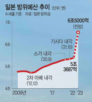 일본은 방위 전략 변화에 따라 방위비도 현재 국내총생산(GDP)의 1% 수준에서 5년 뒤 2%로 늘린다. 개정 예정인 안보 문서 3건에 방위예산은 2023~2027년 5년 동안 합계 43조 엔(약 408조 원)으로 책정됐다. 이는 현재 25조9000억 엔(지난 5년간 방위비 합계) 대비 1.5배 수준이다. 방위비 중 대부분은 미사일 실전 배치에 쏟아붓는다. 일본 정부는 향후 5년간 5조 엔을 투입해 장사정 미사일을 배치할 계획이다. 일단 미국의 순항미사일인 토마호크 미사일을 수백 발 들여오고 개량 작업을 통해 자국산 ‘12식 지대함 유도탄’의 사정거리를 늘린다는 전략이다.