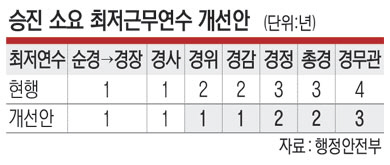 순경에서 경무관까지 승진하는 데 드는 최저근무연수는 16년에서 11년으로 단축한다. 성과가 우수한 경찰관은 순경에서 출발하더라도 40대 후반, 50대 초반이면 경무관까지 승진할 수 있는 셈이다. 정부는 현재 3.2%인 순경 등 일반직 출신의 경무관을 가능한 한 빨리 20%까지 끌어올린다는 계획이다. 윤희근 경찰청장은 이날 “금년도 경무관 승진 자리의 20% 정도를 일반 순경 출신으로 하려는 목표를 가지고 있다”고 밝혔다.
