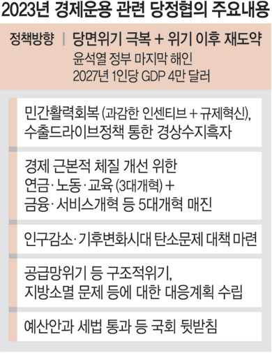 19일 열린 ‘2023년도 경제정책방향 당·정협의회’에서 국민의힘과 정부는 내년도 어려운 경제 상황과 거대야당의 ‘발목잡기’에도 불구하고 윤석열 대통령의 임기 5년 차에 ‘국민소득 4만 달러 시대’를 열겠다는 의지를 강하게 피력했다. 이를 위해 우선 경제위기 상황에서 민생을 적극적으로 챙기는 한편, 구조개혁과 규제 철폐 등 우리 경제의 근본적인 체질개선에 나서 ‘두 마리 토끼’를 모두 잡겠다는 계획을 내놨다. 국민의힘은 인구감소와 지방소멸, 기후변화 등 현안에 대해서도 정부가 경제운용의 중심에 두고 적극적으로 대책을 마련해 달라고 정부에 요청했다.