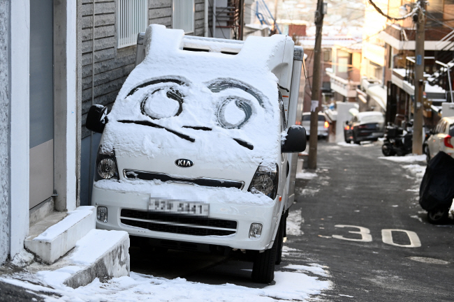 골목길에 세워진 트럭 앞 유리에 쌓인 눈(雪) 위로 눈(目, 眼)이 그려져 있다.