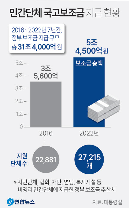 전날 이관섭 대통령실 국정기획수석은 용산 대통령실에서 열린 ‘비영리민간단체 보조금 현황과 향후 계획’ 브리핑에서 비영리 민간단체에 지급한 정부 보조금이 지난 2016년 3조5600억 원에서 2022년에는 5조4500억 원으로 추산됐다는 조사 결과를 발표했다. 지원단체 수도 2016년 2만2881개에서 7년간 4334개가 증가해 2022년 2만7215개로 늘었다.