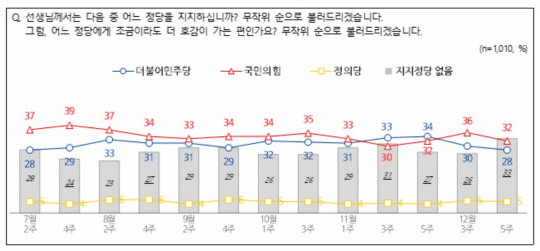 엠브레인퍼블릭ㆍ케이스탯리서치ㆍ코리아리서치ㆍ한국리서치가 지난 26일~28일 전국 18세 이상 1010명을 대상으로 진행한 12월 5주 전국지표조사(95% 신뢰수준에 표본오차 ±3.1%포인트)에서 국민의힘 지지도는 32%, 민주당은 28%로 집계됐다. 정의당 5%, ‘그외 다른 정당’ 1%, ‘지지하는 정당이 없다’ 33%, ‘모름·무응답’ 1%로 나타났다.
