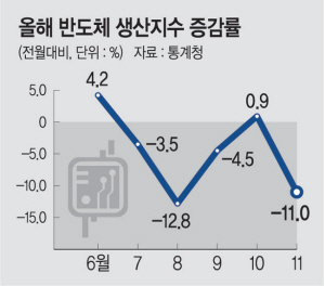 11월 생산이 다섯 달 만에 소폭 증가했지만 수출주력상품인 반도체의 생산은 두 자릿수 이상 급감했다. 수출이 지난달까지 두 달 연속 마이너스를 기록한 데 이어 소비마저 3개월 연속 감소하는 등 내수마저 주춤하면서 한국 경제가 본격적으로 혹한기에 접어들었다는 우려가 잇따르고 있다.