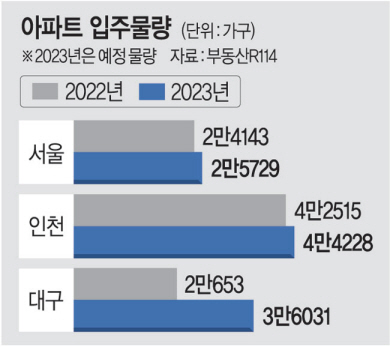 이날 부동산R114 집계를 보면, 올해 전국 아파트 입주 예정물량은 34만1832가구로 지난해 33만2019가구보다 9813가구 늘어난다. 전국 17개 시·도 가운데 10곳에서 지난해보다 입주 예정물량이 증가하는 것으로 조사됐다. 특히 그중 7곳은 매매수급지수가 80을 밑돌고 있다. 아파트를 살 사람은 적은데 입주물량은 쏟아진다는 의미다. 서울(2만5729가구)에서 지난해보다 1586가구, 인천(4만4228가구)에서는 1713가구 더 많은 입주물량이 나오게 된다. 서울은 지난달 26일 기준 아파트 매매수급지수가 63.1에 그쳤고, 인천도 64.6에 불과했다.