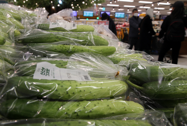 이어지는 한파에 채소 가격이 천정부지로 뛴 가운데 5일 서울의 한 대형마트에 한 달 새 2배 가까이 오른 오이가 진열돼 있다.
