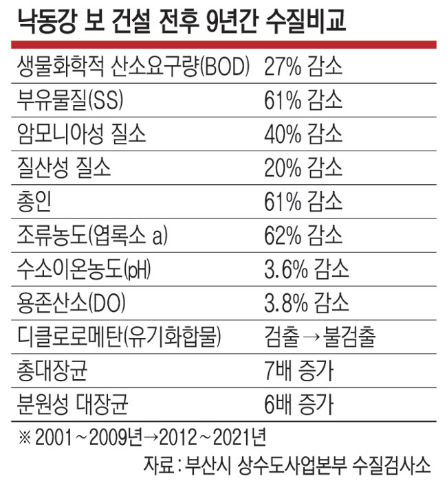 부산시 상수도사업본부는 부산 상수원의 90%를 차지하는 낙동강 물금·매리 취수원의 수질이 보 건설 등 4대강 사업으로 대폭 개선됐다고 9일 밝혔다. 수질 수치는 2001년부터 2021년까지 총 20년에 대해 낙동강 보 건설기간 2년(2010∼2012년)을 제외하고 평균 수질을 상수도본부 수질검사소가 비교·평가한 결과다.