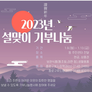 이밖에도 종로구는 오는 13일까지 이웃사랑의 마음을 나누는 ‘설맞이 기부나눔 행사’(포스터)를 진행한다. 기부 가능 품목은 장기간 보관할 수 있는 통조림, 캔 음료, 쌀 등의 식품과 비누, 샴푸, 치약, 칫솔, 세제, 휴지와 같은 각종 생활용품이다. 참여를 원하는 누구나 구청 복지정책과 또는 가까운 동 주민센터 내 설치한 나눔상자에 물품을 넣으면 된다. 모인 물품은 16일 종로구푸드뱅크·마켓센터를 통해 홀몸어르신, 장애인 및 다문화가정 등에 골고루 제공 예정이다.
