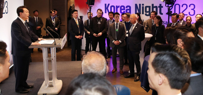 윤석열 대통령이 18일 오전 스위스 다보스 아메론 호텔에서 열린 ‘한국의 밤’ 행사에 참석해 인사말을 하고 있다. 이날 행사에는 페르디난드 마르코스 필리핀 대통령, 알렉산다르 부치치 세르비아 대통령, 클라우스 슈바프 세계경제포럼(WEF) 회장, 이재용 삼성전자 회장, 최태원 SK그룹 회장, 정의선 현대차 회장 등 국내외 정·재계 주요 인사들이 대거 참석했다.