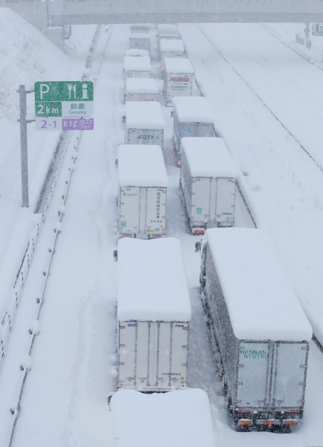 한국뿐 아니라 일본에서도 25일 폭설이 내린 가운데, 미에현 요카이치의 고속도로 위에 트럭들이 움직이지 못한 채 서 있다. 특히 10년 만의 최저기온인 영하 12.8도를 기록한 북동부 지역은 최대 88㎝의 적설량을 기록했으며 폭설로 5명이 숨졌다.