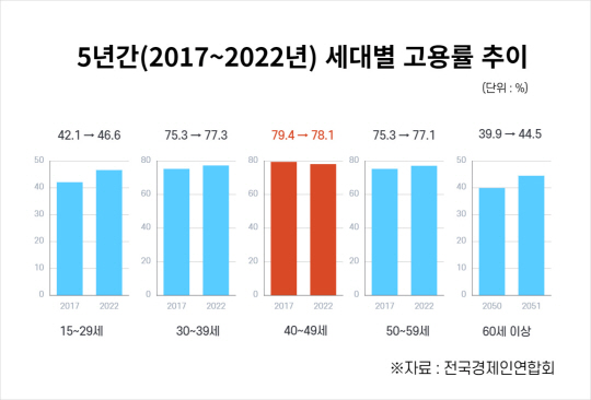 이날 전국경제인연합회(전경련)가 통계청 경제활동인구조사를 바탕으로 지난 2017년~2022년 사이 최근 5년간 세대별 고용지표 추이를 분석한 결과에 따르면 전체 세대 중 유일하게 ‘40대’만 고용률이 감소한 것으로 나타났다.