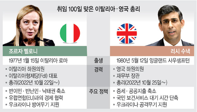 나란히 취임 100일을 맞은 조르자 멜로니 이탈리아 총리와 리시 수낵 영국 총리에 대한 평가가 엇갈리고 있다. 두 정상 모두 우크라이나 사태와 극심한 경제 불황, 리더십 공백과 혼란한 국내 정치 등 녹록지 않은 상황에서 지휘봉을 잡았지만, 멜로니 총리는 실용 노선을 앞세워 ‘극우 정치인’ 이미지를 깨뜨린 반면, 수낵 총리는 별다른 성과를 거두지 못한 채 존재감을 잃어가고 있다는 평가가 나온다.
