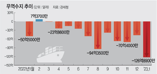 올해 1월 수출액 462억7000만 달러는 전년 동월 대비 16.6%(91억9000만 달러)나 급락한 수준으로 주력 수출 품목인 반도체 수출이 44.5% 급락한 영향이 컸다. ‘반도체 수출 급감→전체 수출 하락→대규모 무역수지 적자’로 이어지는 악순환이 현실화하고 있다. 1월 수입액(589억6000만 달러) 역시 2.6% 줄었는데 수출 감소율이 수입 감소율을 압도하면서 무역수지도 큰 폭의 적자를 기록했다. 1월 무역수지 적자 규모는 126억9000만 달러로 수출입 통계 작성이 시작된 1956년 이후 사상 최대치다.