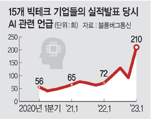 5일 블룸버그에 따르면 최근 실적발표에서 미국 15개 빅테크 기업의 ‘AI’ ‘머신러닝(Machine learning)’ 등 용어 사용이 210회에 달한 것으로 집계됐다. 지난해 같은 시기 72회에서 3배 가까이 급증한 수치며 2013년 이후 최다다. 특히 AI 관련 용어 사용은 마이크로소프트가 챗GPT를 개발 중인 오픈AI 연구소에 거액을 투자했다는 사실이 알려진 2020년 중반부터 서서히 늘기 시작해 지난해 11월 챗GPT가 공개와 동시에 인기를 얻기 시작한 이후 급증했다.