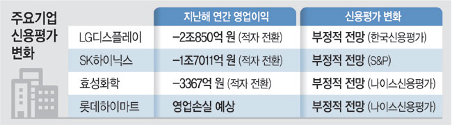 신평사들은 기업들이 실적을 발표하기 무섭게 신용등급을 조정하고 있다. 2조 원대 적자를 낸 LG디스플레이의 경우 국내 3대 신평사가 일제히 신용등급 영향 검토에 들어갔다. 특히 한국신용평가는 LG디스플레이의 무보증사채 등급 전망을 기존 ‘안정적’에서 ‘부정적’으로 낮췄다. 세계 경기 침체로 전방수요가 위축돼 당분간 영업실적 부진이 지속할 것으로 보이며, 현금 창출력 약화에 손상차손(미래 경제적 가치가 장부가보다 낮아질 가능성에 대비해 손실을 반영) 발생으로 재무안정성도 저하됐다는 이유에서다. 나이스신용평가는 지난해 4분기 1조 원대 영업손실을 낸 SK하이닉스에 대해 “반도체 업황 하락 사이클이 장기화하면 재무 부담 증가 폭이 예상을 웃돌 수 있어 지속적인 검토를 통해 신용도에 반영하겠다”고 밝혔다. 글로벌 신평사 스탠다드앤드푸어스(S&P)는 지난 3일 메모리 반도체 수요 감소와 과잉 재고를 근거로 SK하이닉스의 등급 전망을 ‘부정적’으로 내렸다. 신용등급은 BBB-를 유지했다.