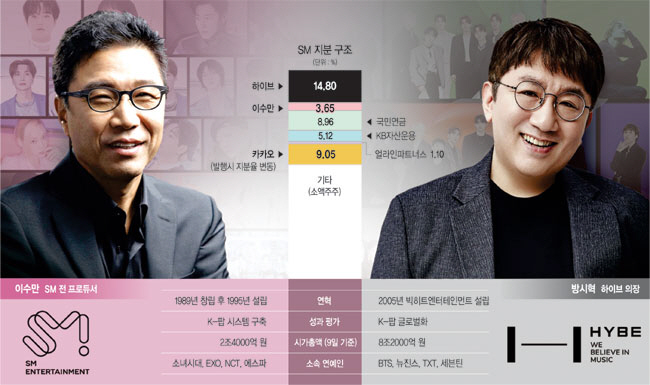 하이브는 SM 창업주인 이수만 전 프로듀서가 보유한 지분 14.8%를 4228억 원에 인수하는 계약을 체결했다고 10일 밝혔다. 이로써 SM의 최대주주에 등극한 하이브는 향후 지분 공개 매수를 통해 지분율을 40%까지 끌어올려 오는 3월 열리는 주주총회에서 경영권까지 움켜쥐겠다는 복안이다. 방시혁 하이브 의장은 “이수만이 추진한 메타버스 구현, 멀티 레이블 체제 확립 같은 전략적 방향성에 전적으로 공감했다”고 밝혔다. 하지만 하이브와 SM의 외형적 성장과 별개로 내부 지분 싸움은 더욱 치열해질 수밖에 없다. 그동안 SM과 하이브는 불편한 관계였다. 후발주자인 하이브가 BTS를 앞세워 모든 기록을 갈아치우며 SM의 입지가 좁아졌기 때문이다. 그러나 지난 8일 카카오가 SM 지분 9.05%를 확보하기로 발표하면서 국민연금(8.96%), KB자산운용(5.12%) 등 우호 지분을 더해 이 전 프로듀서의 지분(18.45%)을 넘어서자 이 전 프로듀서가 하이브에 도움을 요청했고, 하이브가 ‘백기사’로 나섰다는 분석에 무게가 실린다.