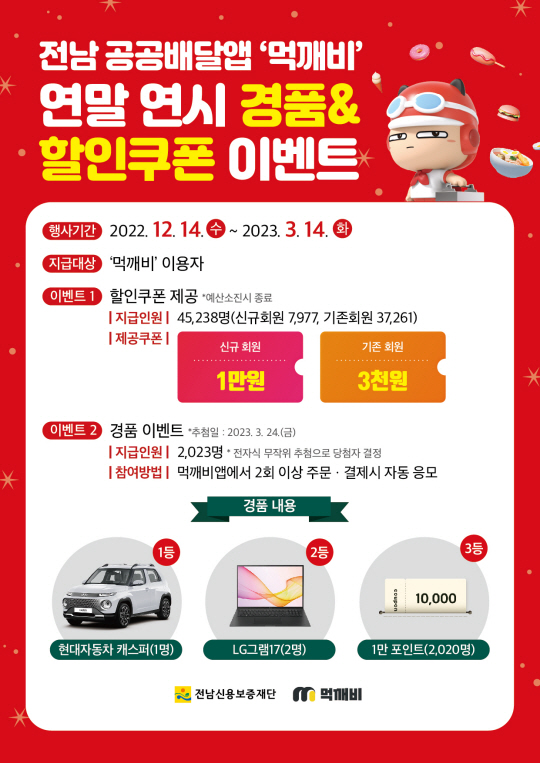 전남도는 공공배달앱 ‘먹깨비’ 활성화를 위해 현대자동차 캐스퍼를 내걸고 푸짐한 경품 이벤트를 진행한다고 14일 밝혔다.