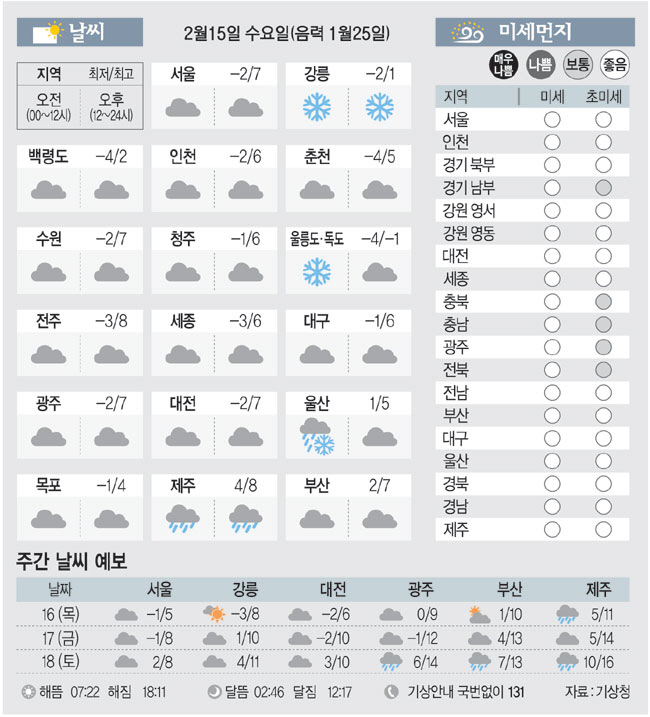 [날씨이야기] 2월15일 수요일(음력 1월25일)