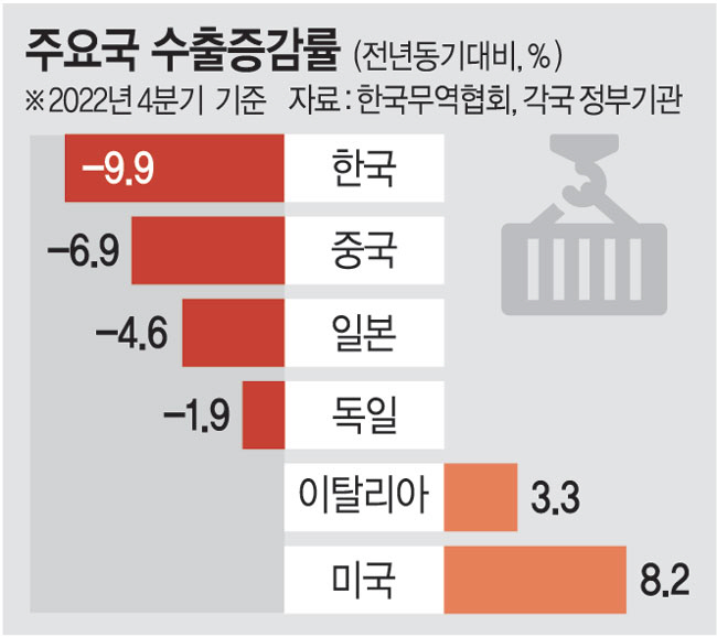 한국의 수출 감소 폭이 주요 수출국 가운데 가장 큰 것으로 나타났다. 올해 상반기에도 제로 코로나 정책에 따른 중국 경제 회복 가능성은 긍정적 요소이지만 러시아·우크라이나 전쟁, 정보기술(IT) 수요 등이 변수로 작용하면서 어려움이 클 것으로 파악됐다. 반도체 수출 회복 시기도 올해 하반기 이후로 예상됐다. 무역업계는 수출기업에 대한 세제·금융지원과 노동규제 완화 필요성을 제기하고 나섰다.