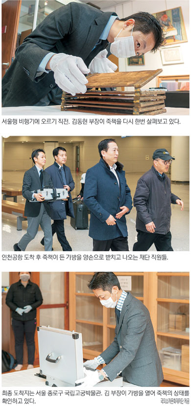 ‘효명세자빈 책봉 죽책’은 어떻게 한국 땅을 밟았을까. 2017년 6월 발견, 7월 매입했다. 그리고 2018년 1월, 죽책은 비행기 여객칸에 실려 귀환했다. 현지 문화재 전문가들을 통해 파리 공항까지 운반됐다. 죽책을 실은 ‘007 가방’은 흔들림 방지를 위해 공간을 꽉 채워 넣었고, 재단 직원들은 좌석을 하나 더 구매했다. 당시 운반을 위해 김 부장과 조사활용팀의 김상엽 팀장이 동행했고 죽책은 두 사람 사이에 ‘앉았다’. 끈을 연결해, 두 사람의 허리춤에 묶었고, 자리를 이동할 때나 잠을 자야 할 때는 번갈아 지켰다. 김 부장은 “도저히 좌석 아래로 내려놓을 수가 없었다”고 회고한다. “온전히 환수될 때까지는 모든 게 대외비여서, 내용물을 말할 수도 없고…. 승무원분들께 너무 죄송했어요.”
