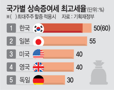 기재부는 지난해부터 ‘응능부담’(개인의 납세 능력에 맞게 과세) 원칙을 고려해 상속세를 유산세 방식에서 유산취득세 방식으로 전환하는 방안을 검토하고 있다. 정부가 유산취득세 도입에 속도를 내는 이유는 세계적인 추세에 발맞춰 세계 최고 수준의 상속세 부담을 완화하기 위한 의도다. 현행 상속세는 유산세 방식으로 세금을 부과하는 탓에 피상속인(물려주는 사람)의 상속재산 총액을 대상으로 세액을 결정한다. 반면 유산취득세 방식은 상속인들이 취득하는 액수에 따라 세액이 정해진다. 더욱이 우리나라의 상속세제는 상속 재산 규모에 따라 10∼50% 누진세율을 적용한다. 특히 과세표준이 30억 원이 넘는 상속재산에 최고세율 50%를 부과한다. 경제협력개발기구(OECD) 국가 중 일본(55%) 다음으로 두 번째로 높다. 최대주주 할증까지 더하면 우리나라의 최고세율은 60%까지 뛰어오른다. 일본은 유산취득세를 시행하고 있다. 이 때문에 일본의 상속재산 1억 엔에 대한 평균 실효세율은 12.95%인데, 100엔을 1000원으로 가정하고 산정한 우리나라의 상속재산 10억 원에 대한 실효세율은 28.09%에 달한다. OECD 23개국 중 유산세 방식을 채택한 곳은 우리나라를 비롯해 미국·영국·덴마크 등 4곳뿐이다.