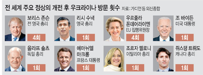 이탈리아 ‘극우’ 정상 조르자 멜로니 총리가 21일 우크라이나 키이우를 전격 방문해 우크라이나에 대한 확고한 지지를 표명했다. 오는 24일 러시아의 우크라이나 침공 1년을 앞두고 조 바이든 미국 대통령에 이어 주요 유럽국 정상들이 우크라이나를 직접 찾으며 러시아에 강한 경고의 메시지를 던지는 것으로 풀이된다. 주요 7개국(G7) 외교장관들도 이날 공동성명을 내고 블라디미르 푸틴 러시아 대통령이 핵무기 통제조약 참여를 중단하면 “러시아를 지원하는 개인·단체에 대한 제재를 더욱 강화할 것”이라고 규탄했다.
