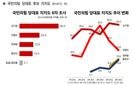 리얼미터가 미디어트리뷴 의뢰로 지난 21∼22일 전국 성인 남녀 1004명(국민의힘 지지층 413명)을 대상으로 한 조사에서 김 후보는 국민의힘 지지층에서 44.0% 지지율로 1위를 차지했다. 이어 안 후보(22.6%), 천 후보(15.6%), 황 후보(14.6%) 순이다.