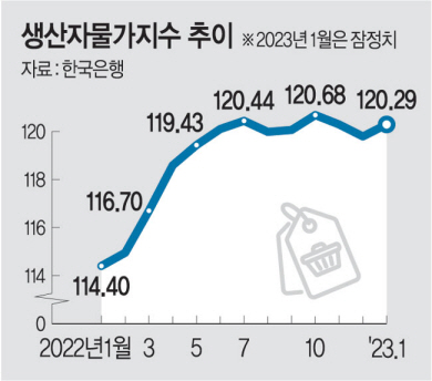23일 한국은행에 따르면 1월 생산자물가지수(잠정)는 지난해 12월보다 0.4% 높은 120.29(2015년 수준 100)를 기록했다. 생산자물가지수는 지난해 11월(-0.3%)과 12월(-0.4%) 두 달 연속 전월 대비 하락했지만, 3개월 만에 상승세로 돌아섰다. 전년 동기 대비 기준으론 5.1%로 높은 수준에 머물렀지만, 상승 폭은 7개월 연속 둔화세를 이어갔다.