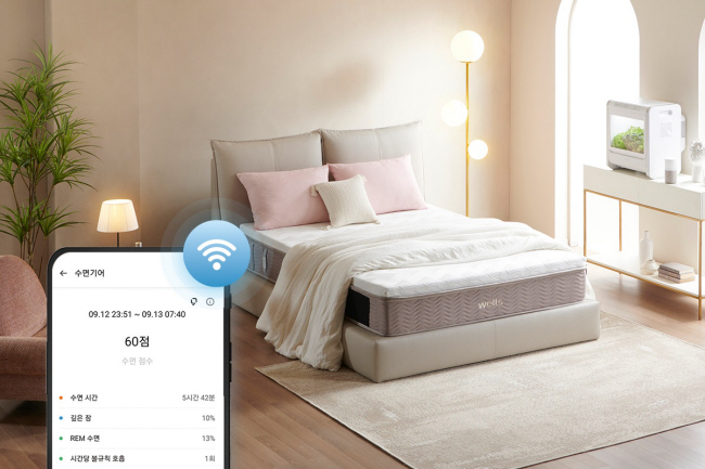 매트리스 커버 아래 ‘웰스 사물인터넷(IoT) 수면 기어’를 장착해 사용자의 호흡 변화와 압력 등을 감지할 수 있도록 했다. 수면 상태를 모니터링해 데이터를 웰스 IoT 앱으로 자동 전송한다. 회사 관계자는 “총 수면 시간, 수면 수요 시간, 숙면 시간, 렘수면(꿈을 꾸는 얕은 잠) 시간, 불규칙 호흡 횟수, 코골이 횟수, 뒤척임 등 7개 수면 정보를 실시간으로 모니터링하고 일별·주간별 변화를 관리해준다”고 말했다.
