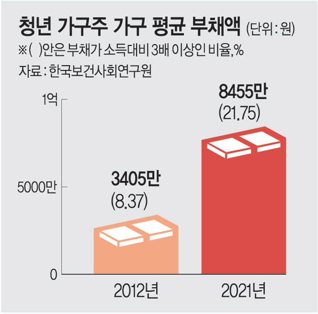 27일 한국보건사회연구원의 ‘청년미래의 삶을 위한 자산 실태 및 대응방안’ 보고서에 따르면 통계청 가계금융복지조사 원자료를 분석한 결과, 청년이 가구주인 가구의 평균 부채는 2021년 8455만 원이었다. 이는 2012년 부채 3405만 원의 2.48배로 늘어난 수치다. 부채는 임대보증금을 제외한 금융부채로, 평균값은 부채가 없는 청년을 포함해 계산됐다. 부채가 있는 청년만을 대상으로 하면 평균 부채액은 1억1511만 원(2012년 5008만 원)으로 치솟았다.