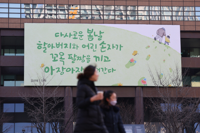 서울 등 전국 한낮 기온이 10도 이상으로 예보된 27일 오전 서울 광화문 교보생명빌딩 외벽에 김선태 시인의 시 ‘단짝’ 글귀로 꾸며진 광화문글판 봄 편이 걸려 있다.