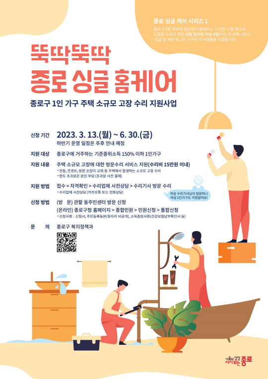 서울 종로구는 오는 13일부터 1인가구 주거생활 지원을 위해 주택 소규모 고장에 대한 수리·보수, 소모품 교체 등을 해주는 ‘종로 싱글 홈케어’(포스터)를 추진한다고 10일 밝혔다. 집에서 발생하는 각종 잔고장이나 불편사항 대처에 어려움이 많은 1인가구 주민들이 비용 걱정 없이 안심하고 수리를 받아볼 수 있도록 이번 서비스를 시행하게 됐다.