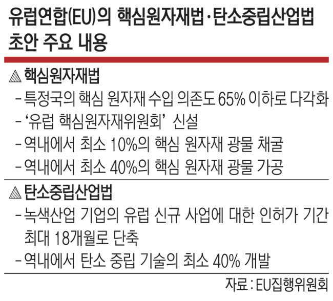 유럽연합(EU)이 공개한 ‘핵심원자재법’(CRMA)과 ‘탄소중립산업법’(NZIA)은 중국산 의존도를 낮추고 미국 인플레이션 감축법(IRA)에 대응하기 위해 도입하는 법안인 만큼 원자재 공급망 안정화·다각화 대책을 뼈대로 한다. 핵심원자재의 EU 내 가공 비중을 최대 40%까지 대폭 늘리고, 청정기술 신규산업에 대한 허가 기간은 수년 걸리던 것을 18개월까지 단축하는 내용을 담고 있다. 산업통상자원부는 17일 “미국 IRA와 달리 두 법에 역외 기업 차별 조항이 없다”는 분석을 내놓으면서도 ‘영구자석 재활용 비율 등에 대한 정보공개 의무화’처럼 우리 기업에 부담이 될 수 있는 조항이 있다고 보고, 다음 주 기업 간담회를 통해 위기·기회 요인 논의에 들어간다.