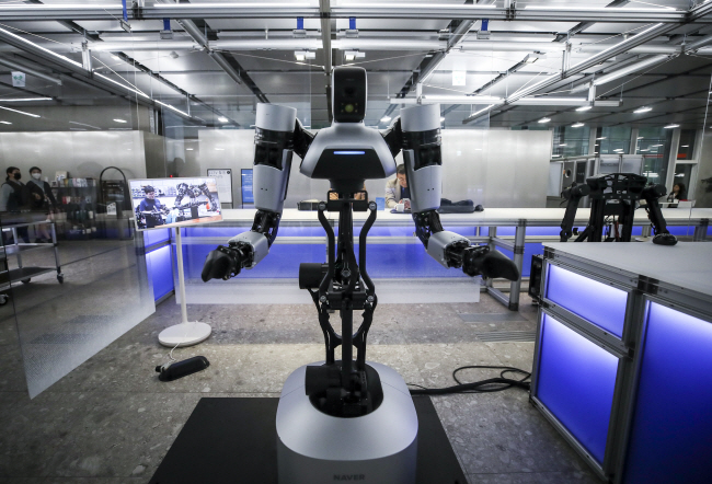 16일 경기 성남시 네이버 사옥에서 네이버의 양팔 로봇 ‘앰비덱스(AMBIDEX)’가 움직이고 있다.