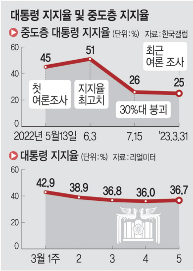 3일 문화일보가 최근 1년간 한국갤럽 여론조사(지난해 3월 첫째 주~올해 3월 마지막 주)에서 자신을 ‘중도층’이라고 답한 응답자의 윤 대통령 지지율을 분석한 결과, 지지율은 지난해 5월 9일 대통령 취임 후 실시한 첫 여론조사(지난해 5월 13일)에서 45%를 기록했다. 대통령 지지율은 이후 40%대를 유지하며 지속적으로 상승해 6월 3일 51%까지 치솟았다. 하지만 7월 1일 조사에서는 37%를 기록하며 지지율이 40%대 아래로 처음 내려갔다. 이후 대통령 지지율은 7월 8일 33%, 7월 15일 26%를 기록하며 지지율 30%대가 붕괴된 뒤 9개월째 상승세를 타지 못하고 있다. 가장 최근인 지난주(올해 3월 31일) 갤럽 조사에선 대통령 지지율이 25%를 기록했는데, 단순 지지율 차이를 놓고 보면 대통령 취임 이후부터 9개월간 20%포인트가량 떨어진 것이다.