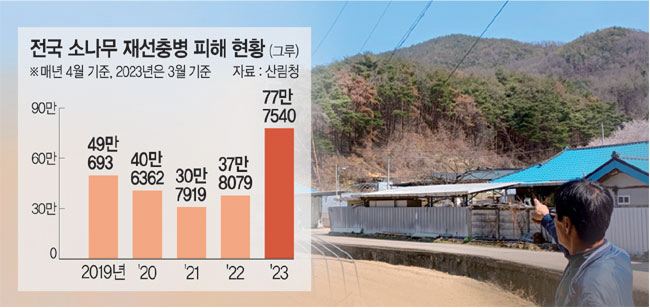 경북지역 올해 재선충병 피해 소나무는 전국 전체 피해의 약 40%를 차지한다. 산림청에 따르면 최근 5년 사이 전국 재선충병 피해 소나무는 2019년(2018년 5월∼2019년 4월) 49만 그루에서 2021년 30만7000그루로 감소하다 올해 들어선 77만7000그루(2022년 5월∼2023년 3월)로 집계됐다. 2년 사이 2.5배로 증가한 셈이며 이달까지 조사하면 피해는 더 늘어날 전망이다.