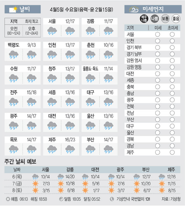 [날씨이야기] 4월5일 수요일(음력·윤 2월15일)