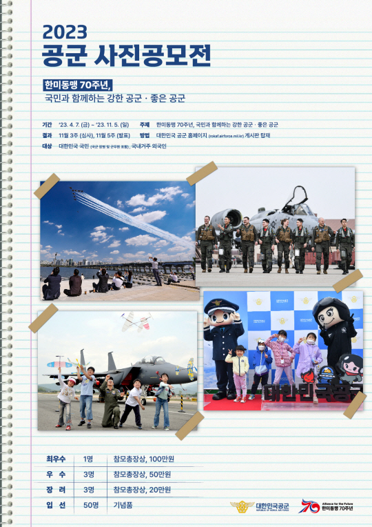 ‘한미동맹 70주년, 국민과 함께하는 강한 공군·좋은 공군’을 주제로 진행되는 이번 공모전은 대한민국 국민 또는 국내 거주 외국인은 누구나 참여가 가능하다.