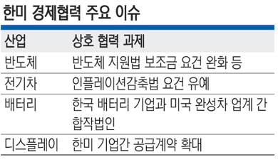 전국경제인연합회 산하 한국경제연구원은 7일 이런 내용의‘한·미 경제협력 10대 이슈’를 발표했다. 10대 이슈 산업은 △반도체 △전기차 △배터리 △디스플레이 △바이오 △수소 △도심항공모빌리티(UAM) △로보틱스 △우주·항공 △문화다.
