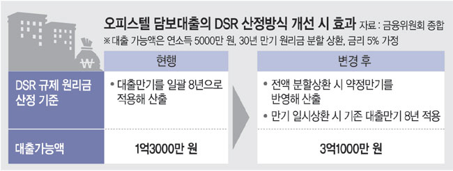 앞으로 오피스텔 담보대출로 받을 수 있는 금액이 경우에 따라 2배 이상으로 늘어난다. 금융당국이 현재 만기 8년으로 묶여 있는 오피스텔 담보대출의 총부채원리금상환비율(DSR·연간소득 대비 원리금 상환 비중) 관련 규정을 일반 주택과 같은 기준(최장 30년 만기)으로 바꿀 방침이다. 대출만기가 길어질수록 나눠서 갚는 원리금 상환 부담도 줄어들어 그만큼 대출을 받을 수 있는 규모도 커진다.
