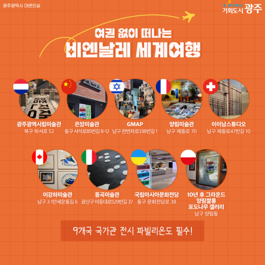 추천 코스는 본 전시와 파빌리온으로 구성된 광주비엔날레 전시공간 곳곳을 담았다. 특히 주변 나들이 장소를 연결해 미술축제를 즐기면서 추억을 남길 수 있도록 했다. 파빌리온 코스는 4월 개관해 현재 관람이 가능한 7개국의 장소가 담겼다. 폴란드와 우크라이나 등 나머지 2개국 파빌리온은 5월 개관한다.