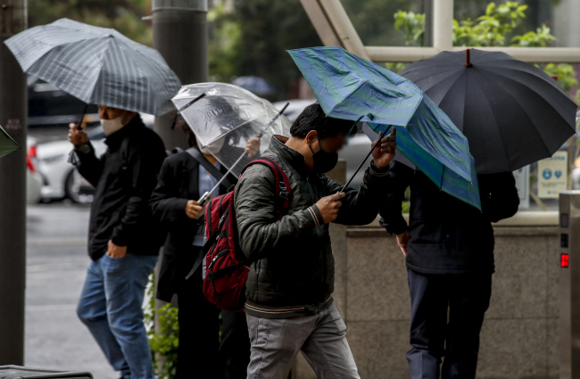 18일 오전 서울 마포구 마포역 인근에서 시민들이 몰아치는 비바람에 맞서 힘겹게 우산을 받쳐 들고 걸어가고 있다.