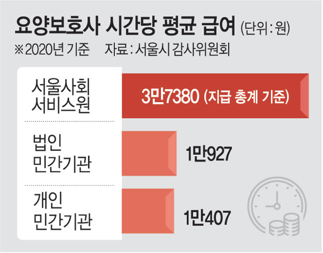 일례로 서사원 시간제 요양보호사의 최대·최소 근로시간 차이는 연 702시간인데 연 급여 차이는 2만5750원에 불과하다. 지난해 7월 기준 요양보호사, 활동지원사 등 돌봄종사자 263명 가운데 단 2명만이 민간기관에서 서비스 제공을 기피하는 야간·주말 근무를 하고 있었다. 더욱이 돌봄의 난도가 높은 이용자에 대한 서비스 비율도 민간기관보다 낮았다. 2021년 기준 방문요양 서비스 등급별 이용자 수를 민간기관과 비교해 본 결과 비교적 서비스 난도가 높은 요양등급 1∼3등급의 이용자 비율은 민간 기관(45.3%)이 서사원(38.2%)보다 오히려 높았다.